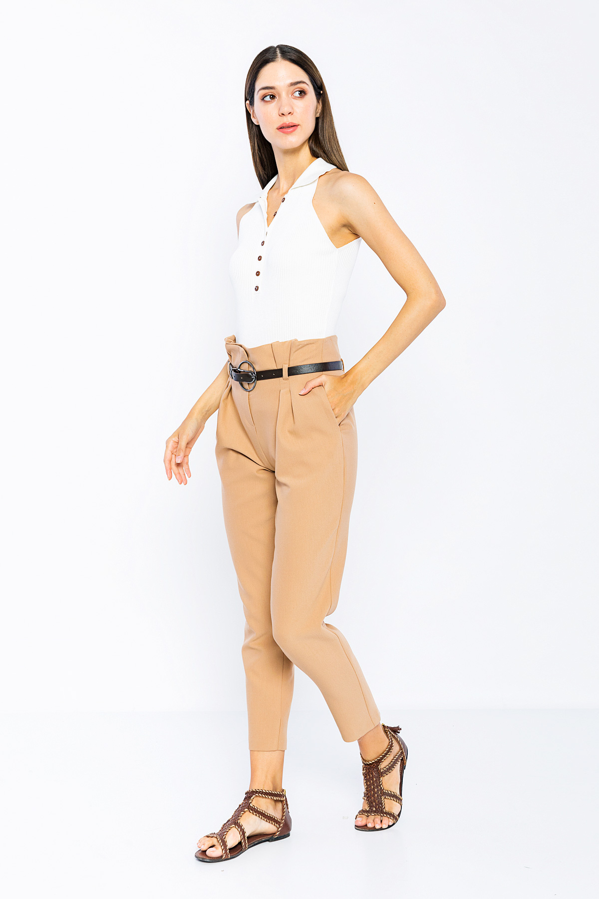 Woman Camel High Waist Belted Work Trousers