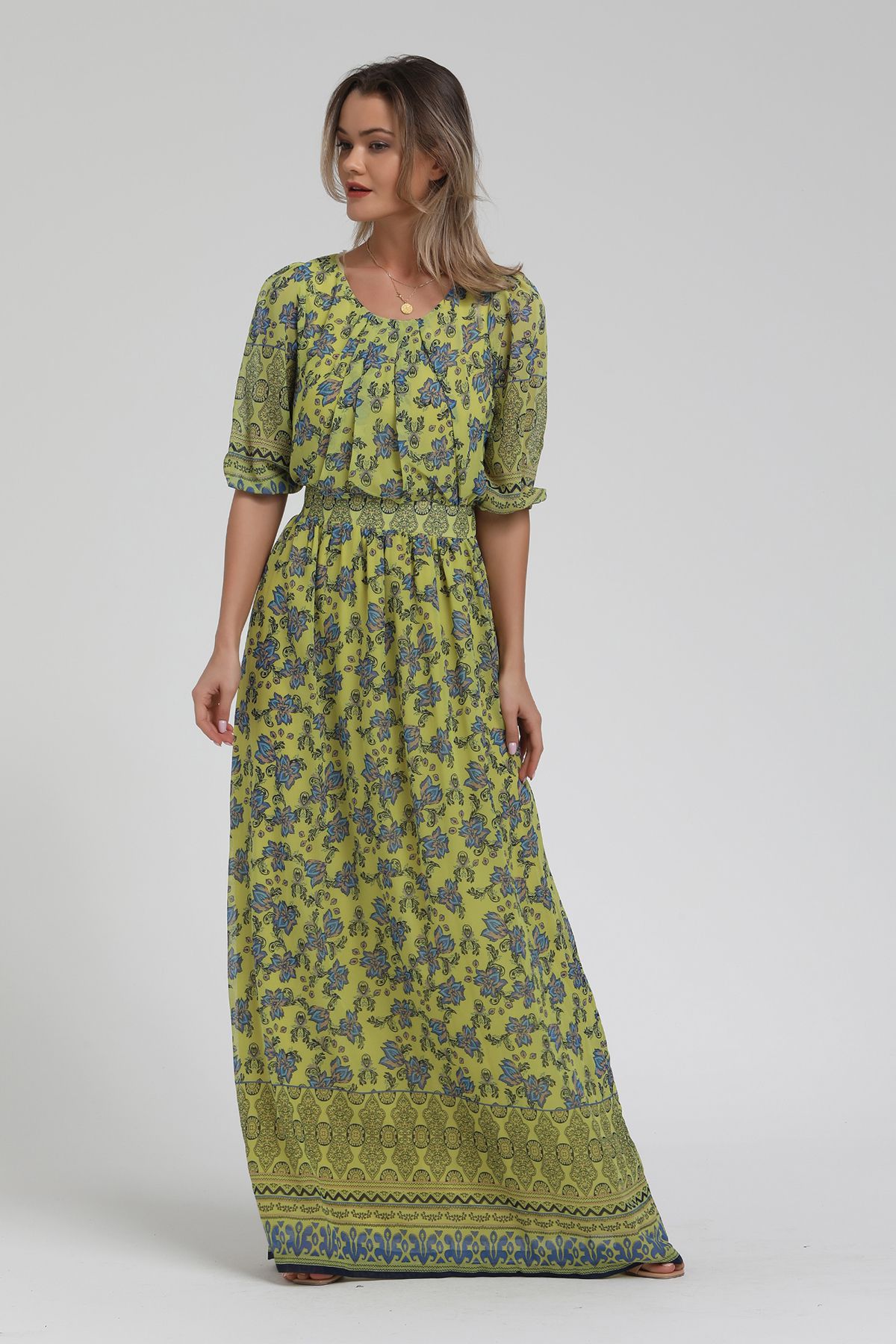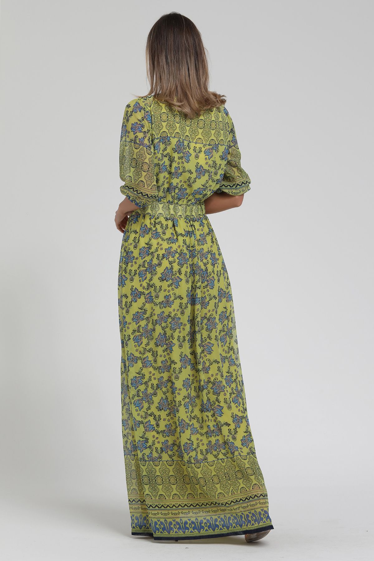 Kadın Açık Yeşil Desenli Uzun Elbise