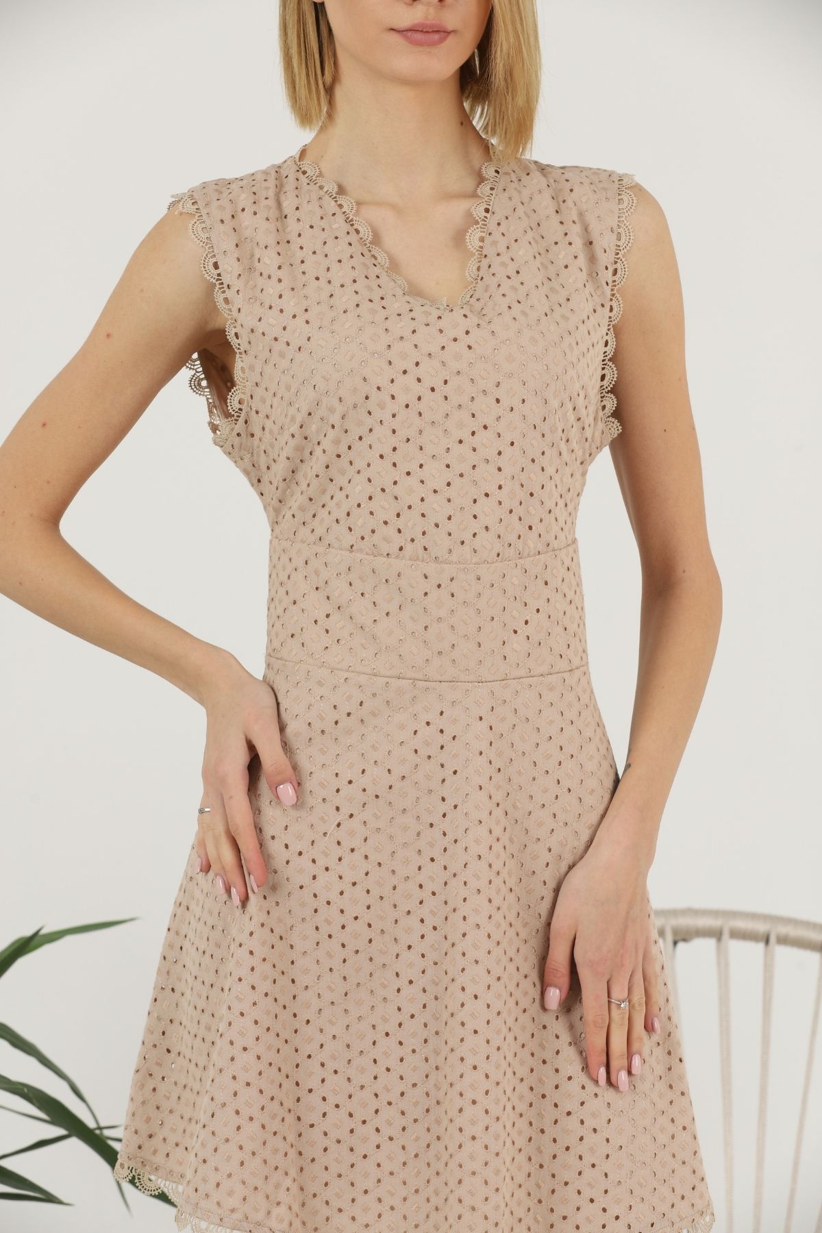 Kadın Bej Brode V Yaka Kısa Kol Mini Elbise