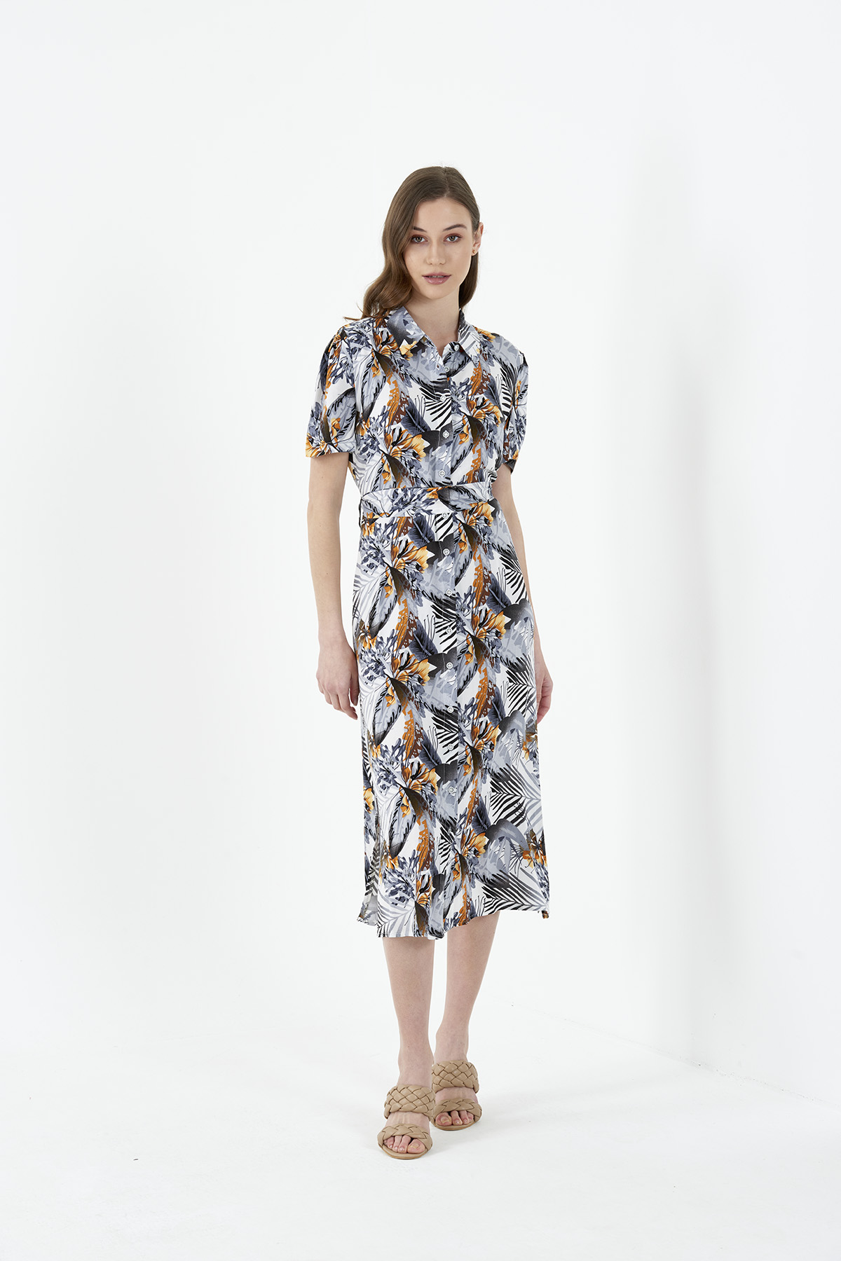 Kadın Gri Karpuz Kol Desenli Midi Gömlek Elbise