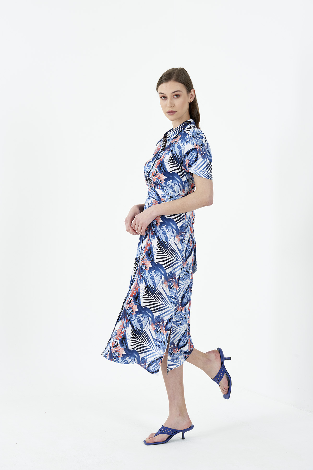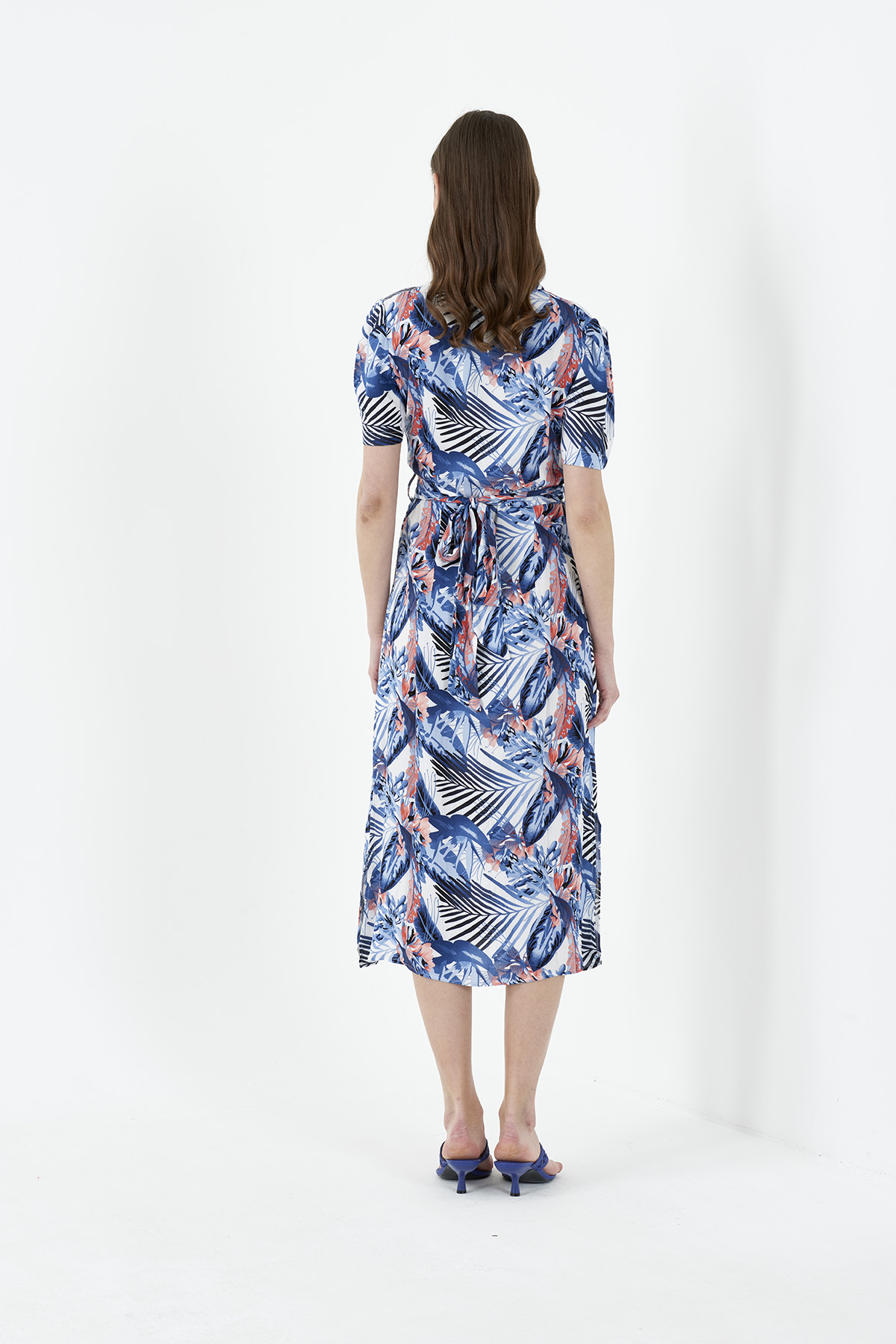 Kadın Mavi Karpuz Kol Desenli Midi Gömlek Elbise