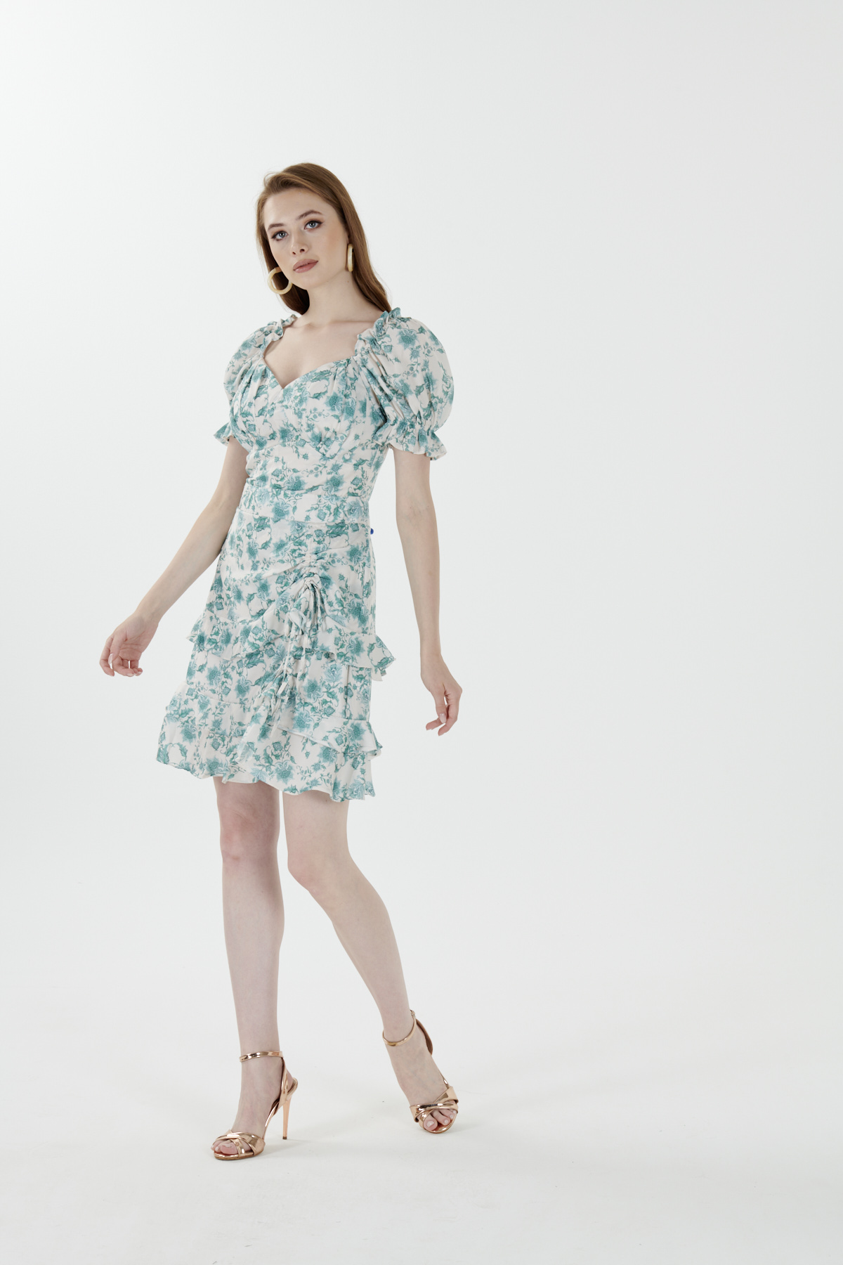 Kadın Yeşil Karpuz Kol Desenli Viskon Mini Elbise