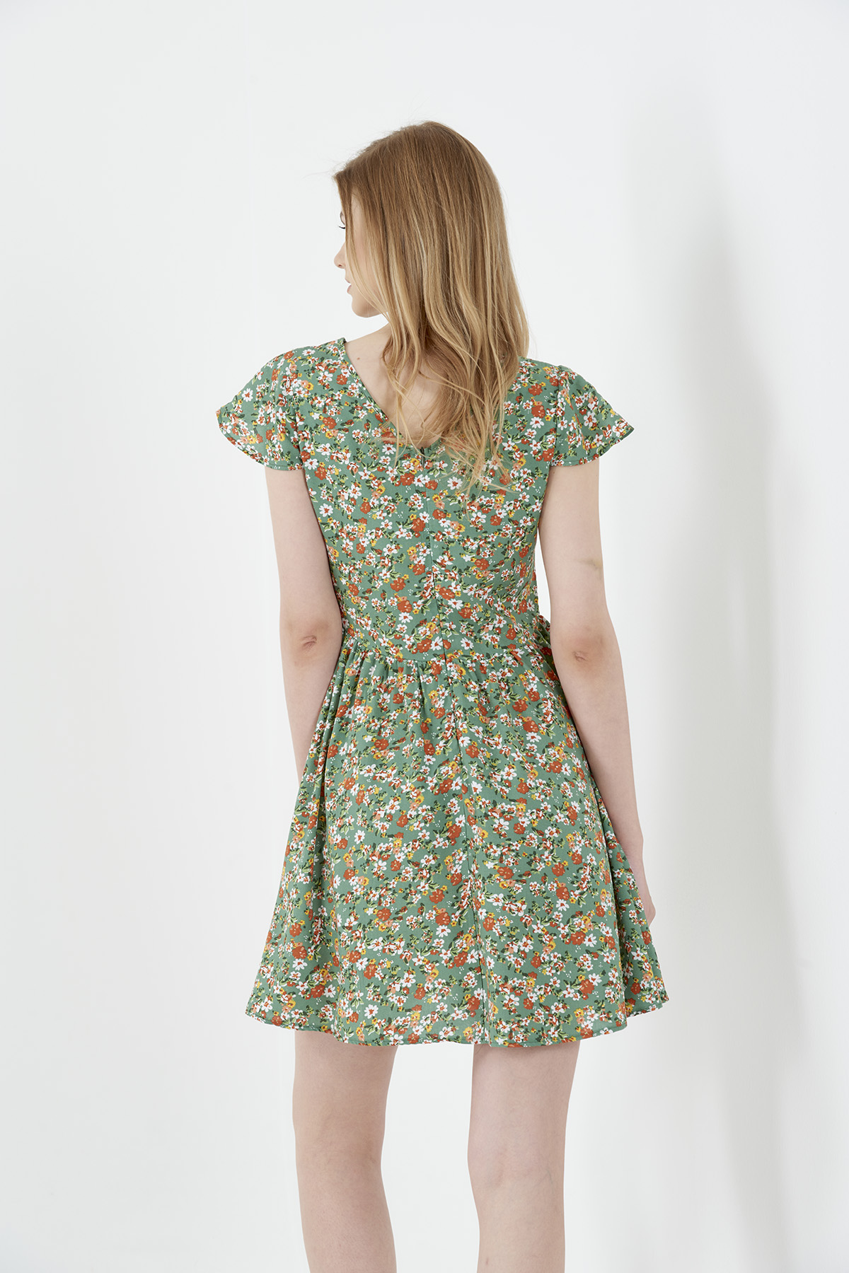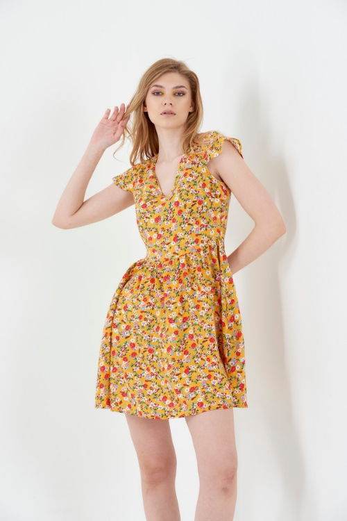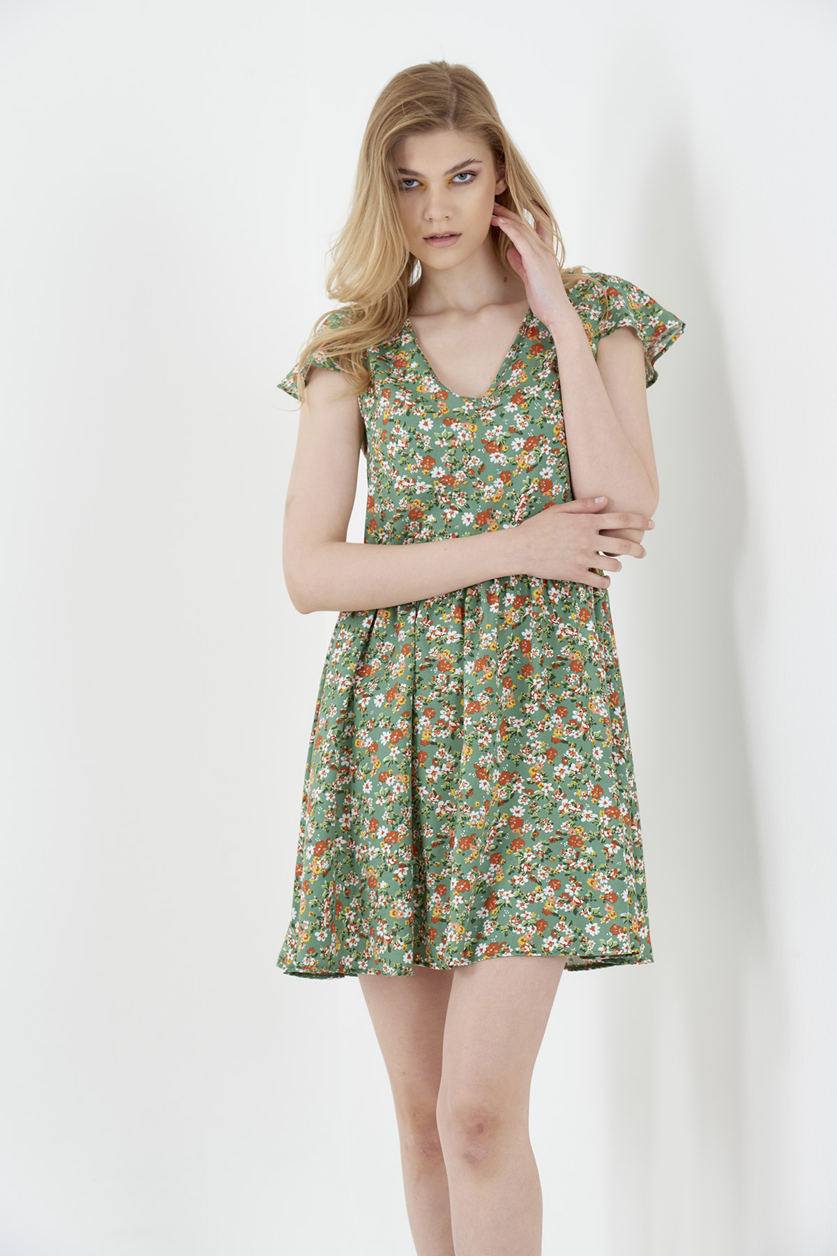 Kadın Yeşil V Yaka Ay Kol Mini Viskon Elbise