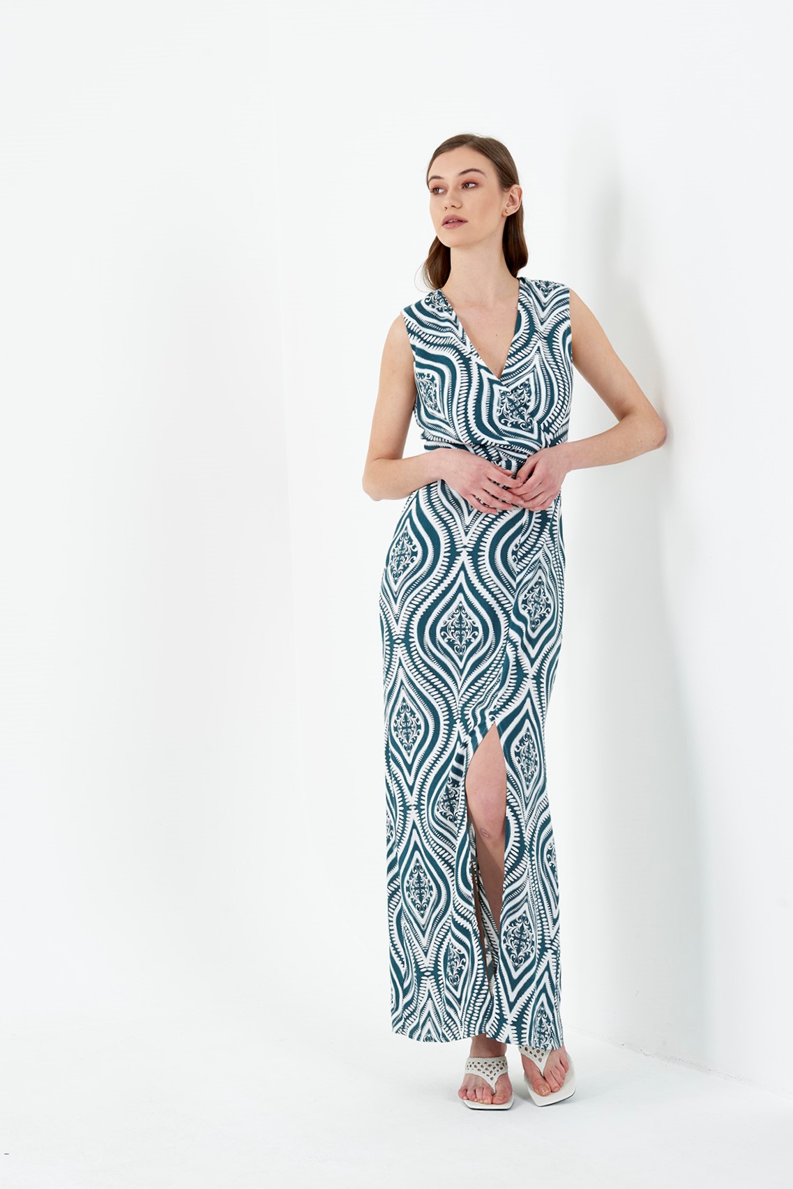 Kadın Yeşil V Yaka Yırtmaçlı Uzun Elbise